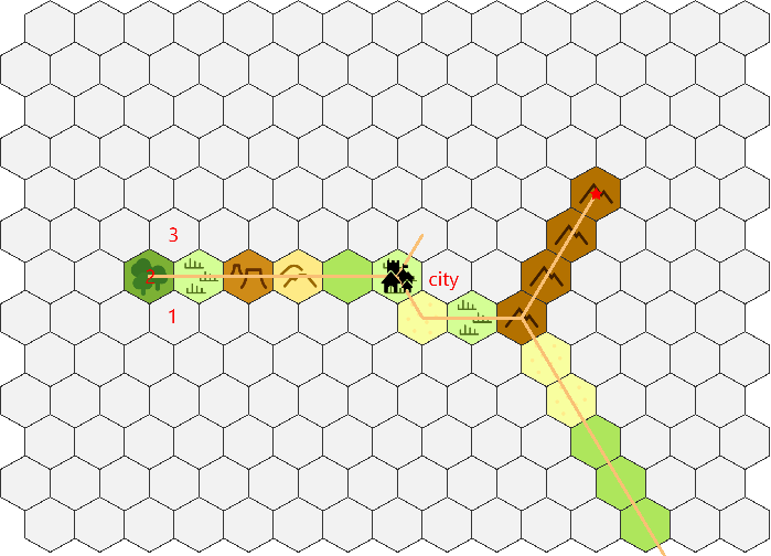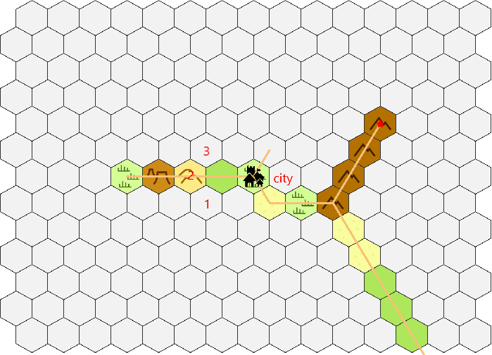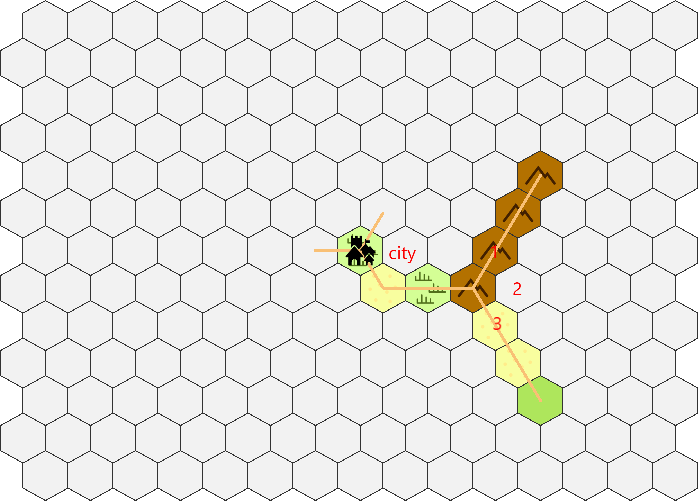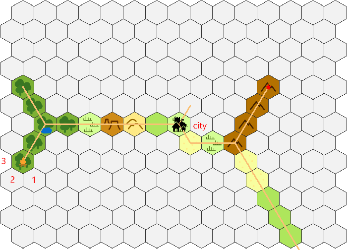 - Repeat step 4 until the road ends or exceeds the limits of your hex paper.