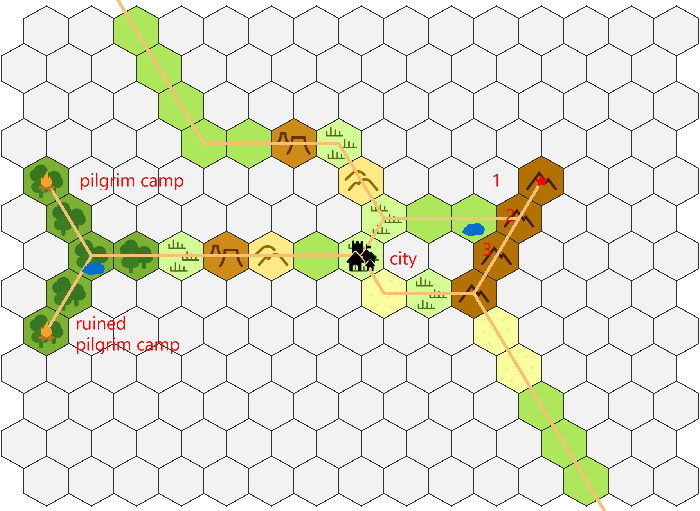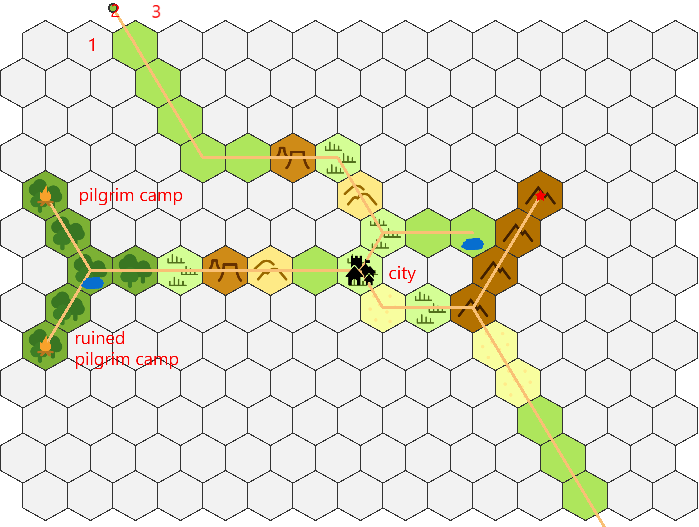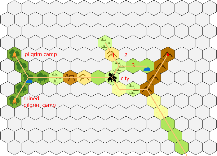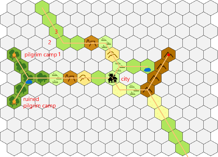 - Roll 6: 2 for direction, 2 for distance. Since it’s the second fork in a row, I establish a landmark. I rolled 4, resulting in a pilgrim camp. (I forgot to label it until starting the third road.)