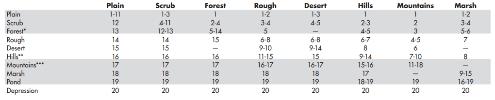 - Only one fork is allowed among the six hexes adjacent to the starting hex. If another fork is rolled, treat it as a direction 2 result and move the distance rolled instead.