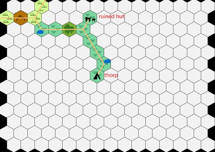 The following figures are examples of different starting locations (thorp, village, and city). I have left the rest of the terrain blank to improve clarity.