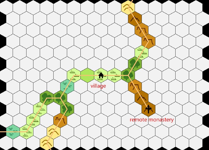 On the whole, I am very happy with this method. As I mentioned at the start, this technique creates roads that feel meaningful and lead to interesting destinations. It’s also relatively straightforward and consistent. As with any procedural generation, it can sometimes lead to wonky results, but these are few and far between as far as roads go. Sometimes a fork in the road will create alternate paths to the same destination (see fig. 5). I don’t consider that a problem however. Often the terrain varies so much that one can make a plausible explanation for one might prefer one route at any given moment. For instance, in fig. 5, my exploration method gives a benefit to those who chart on mountains—they get to see twice as far owing to the elevation—though the western route via the desert hexes would result in a faster trip south.
