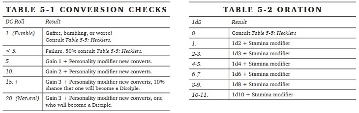 This chapter deviates from the rest of the supplement by providing house rules for running a cleric. Scattered among these rules are tables for conversion checks, orations, exorcism, and hecklers. Its rules for officiating ceremonies, healing, and miracles all lack tables, but that’s not really a huge concern. My biggest issue with this chapter is that some of its ideas are half-baked and poorly organized. For instance, there are two sections for determining how many converts a cleric can yield. One of these is a general conversion check that can be used in public displays, the other is based on the length of their oration (the longer the oration, the more converts). The probability for each table is completely different, however (figure 1). The general conversion table is much harder since a cleric needs to successfully cast a spell and then roll higher than a 5 on this table with a d20. Meanwhile, the oration table is guaranteed to succeed unless the cleric has a negative modifier, as even rolling a 1 with a d8 can net a couple new converts. The only real difference is that a general conversion table offers an incredibly slight chance of gaining clerics a disciple (the significance of disciples is explained in chapter 6—essentially, they maintain things in town when the cleric is away on an adventure).